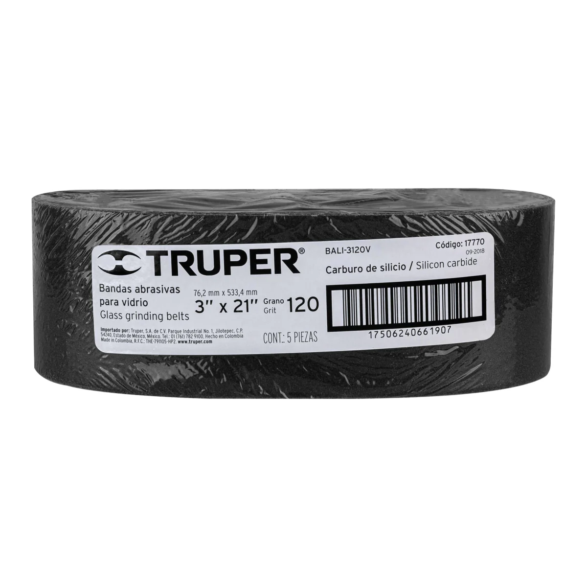 Banda Truper 3×21″ grano 120 para vidrio. Perfecta para pulidos finos en superficies delicadas, su abrasivo de alta calidad asegura precisión y una durabilidad superior. Ideal para vidrieros, artesanos y técnicos que requieren un acabado sin rayones. Paquete con 5 bandas resistentes, diseñadas para brindar resultados consistentes en tareas profesionales o proyectos artesanales.
