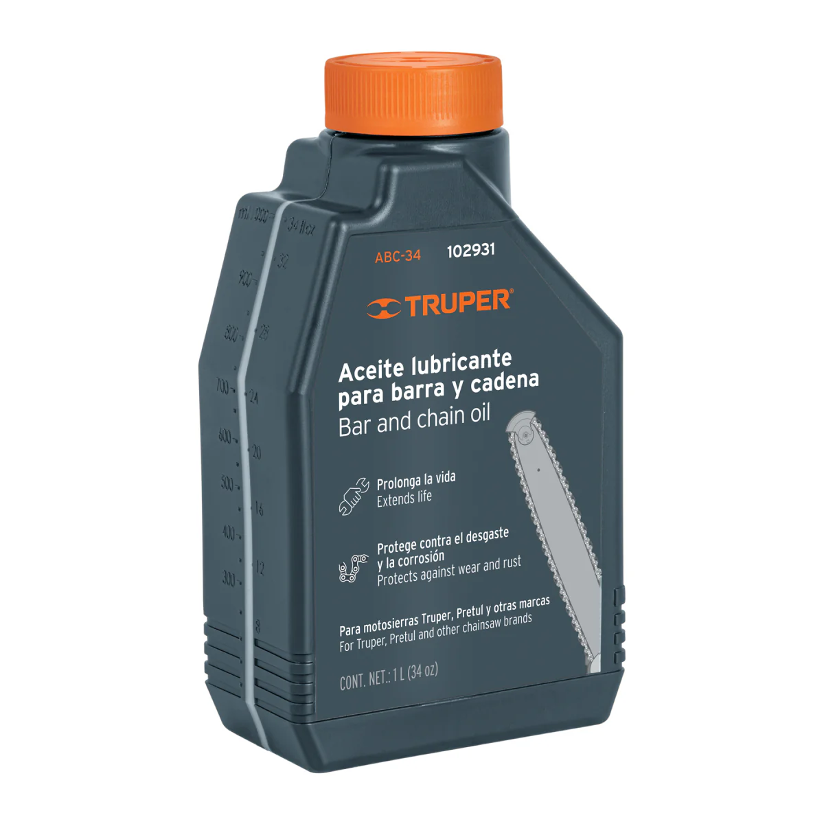 El aceite para barra y cadenas modelo Abc-34 de Truper está formulado específicamente para garantizar un funcionamiento óptimo de motosierras. Su fórmula de alta calidad reduce el desgaste y la fricción, prolongando la vida útil de la herramienta. Ideal para condiciones de trabajo intensivo, asegura un rendimiento eficiente, protegiendo las partes móviles contra el daño y la corrosión.