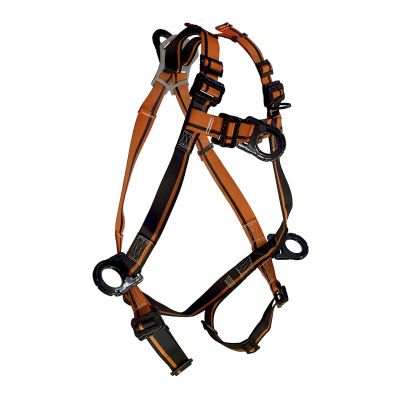 Arnés Dieléctrico Tipo H de 4 argollas, dos argollas laterales, una dorsal y una pectoral con recubrimiento dieléctrico ideal para soportar descargas eléctricas, la fricción y la corrosión, regulable en la zona pectoral y en piernas para ajustarse cómodamente al cuerpo del usuario.