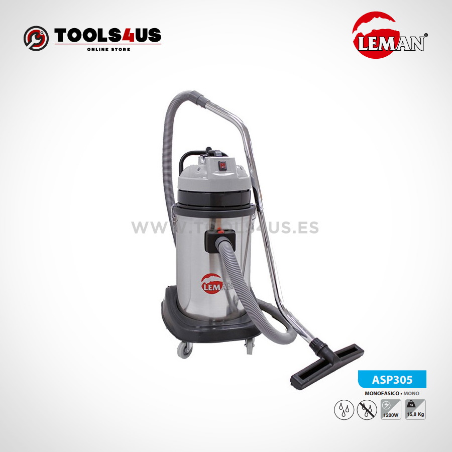 Aspirador Leman con depósito de acero inoxidable y capacidad para 30 litros útiles. Utiliza un motor con sistema de enfriamiento by-pass de 1200W de potencia. Incorpora un filtro permanente de poliéster y ruedas estables y reforzadas.