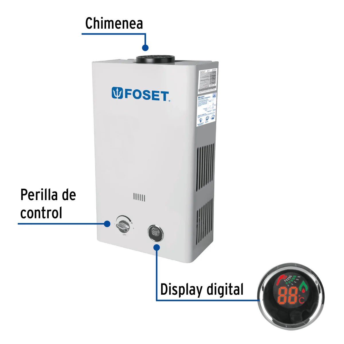 El calentador de agua instantáneo CALE-6I-N Foset es ideal para quienes buscan un suministro continuo de agua caliente de manera eficiente. Con capacidad para 6 litros por minuto y funcionando con gas natural, ofrece una solución instantánea sin necesidad de tanque. Su diseño compacto y funcional se adapta fácilmente a espacios pequeños, mientras que su tecnología asegura un calentamiento rápido y seguro, siendo perfecto para hogares o pequeños negocios.