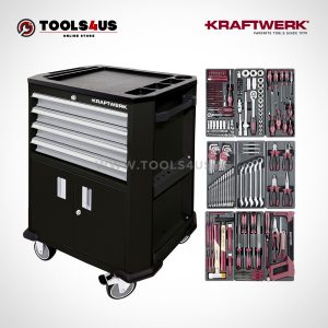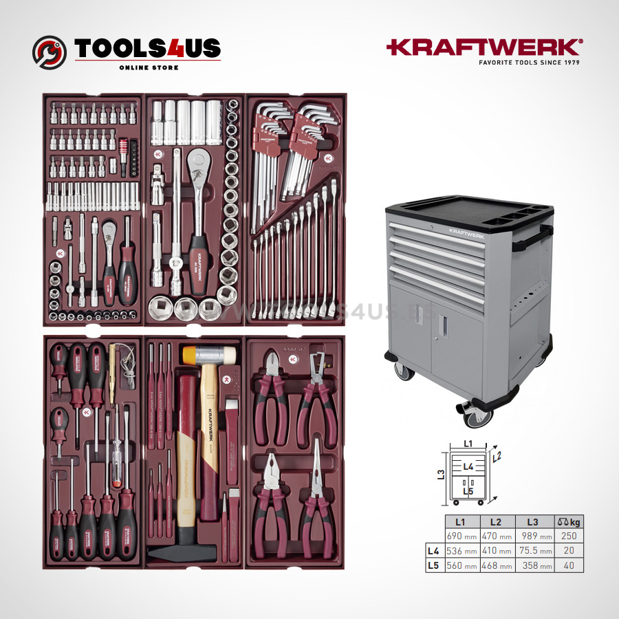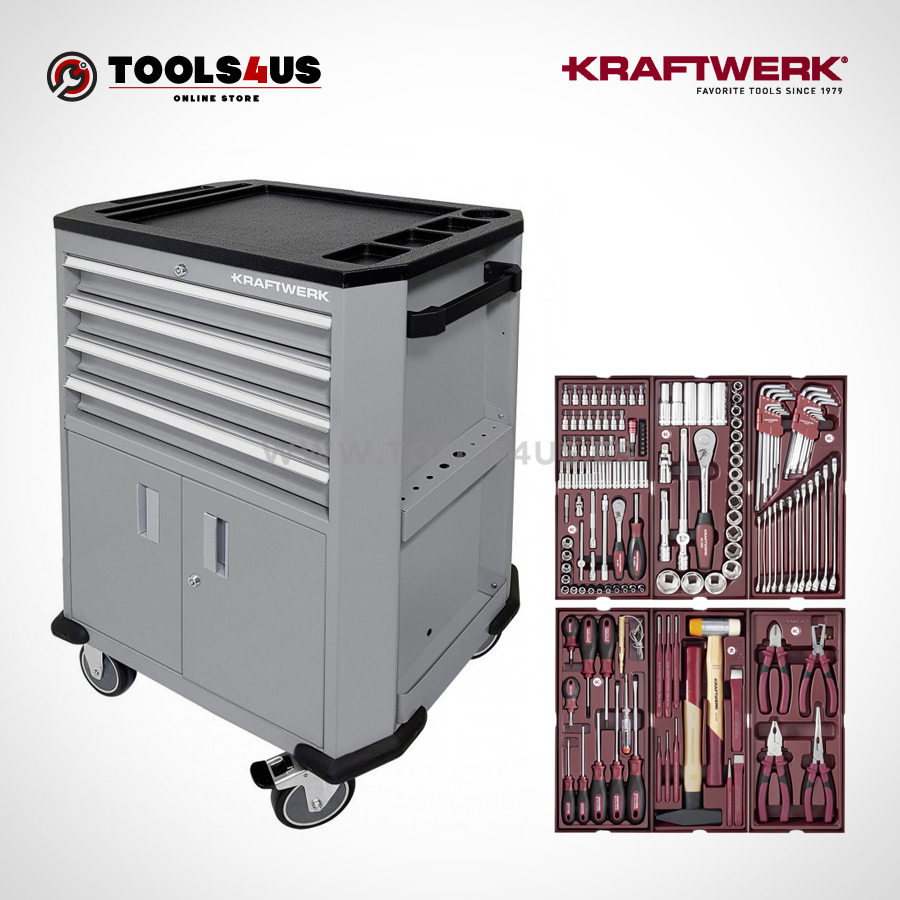 Carro largo de herramientas para taller con 4 cajones + espacio de almacenaje KRAFTWERK®. Equipado con 150 herramientas profesionales