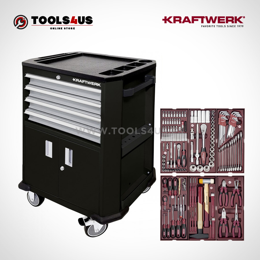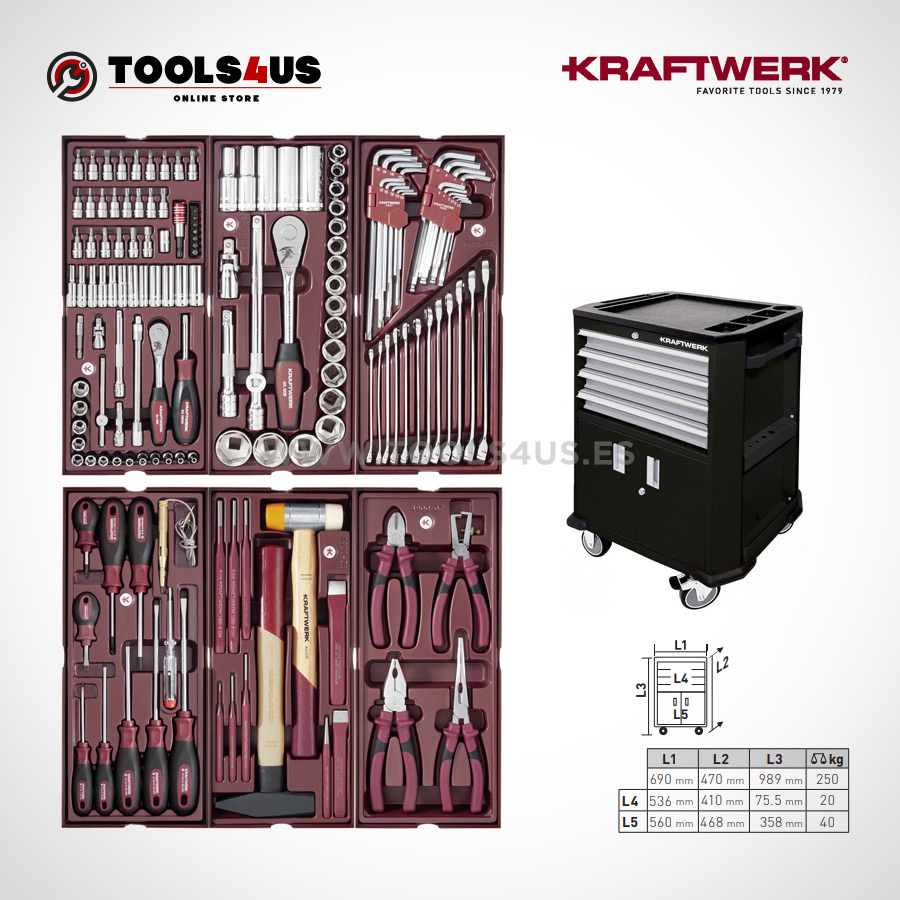 Carro largo de herramientas para taller con 4 cajones + espacio de almacenaje KRAFTWERK®. Equipado con 150 herramientas profesionales