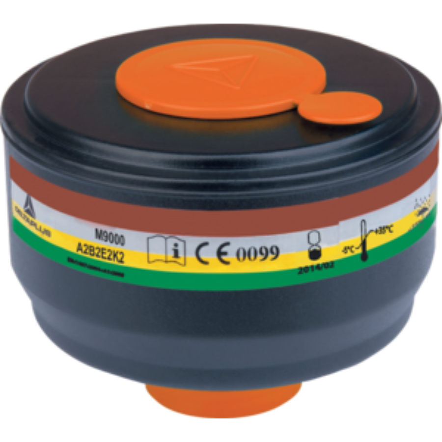 Caja de 4 cartuchos filtrantes A2B2E2K2 para mascarillas integrales M9200 ROTOR GALAXY y M9300 STRAP GALAXY. Las tapas resellables permiten reutilizar el cartucho después de su uso para una vida más larga. Sistema de montaje universal DIN40.