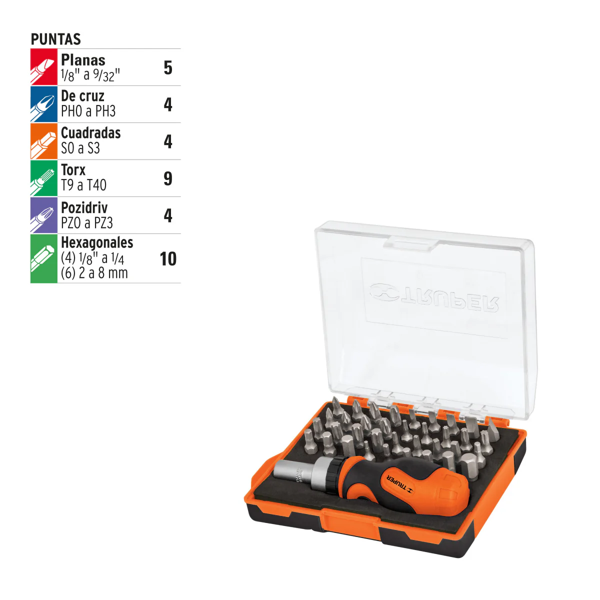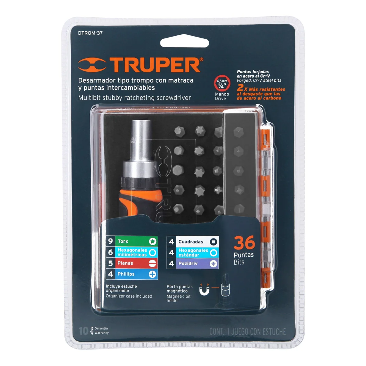 El desarmador T/Trompo 36Pun.Dtrom-37 Truper es una herramienta de alta calidad y resistencia, ideal para realizar trabajos de desarmado y ensamblado de diferentes tipos de tornillos. Su diseño ergonómico y mango antideslizante brindan comodidad y seguridad durante su uso. Cuenta con un eje de acero templado que garantiza durabilidad y resistencia a la corrosión. Además, su punta magnética facilita la manipulación de los tornillos, evitando su caída o pérdida. Con 36 puntas intercambiables de diferentes tamaños y formas, este desarmador se adapta a una amplia variedad de necesidades y se convierte en una herramienta indispensable en cualquier caja de herramientas.
