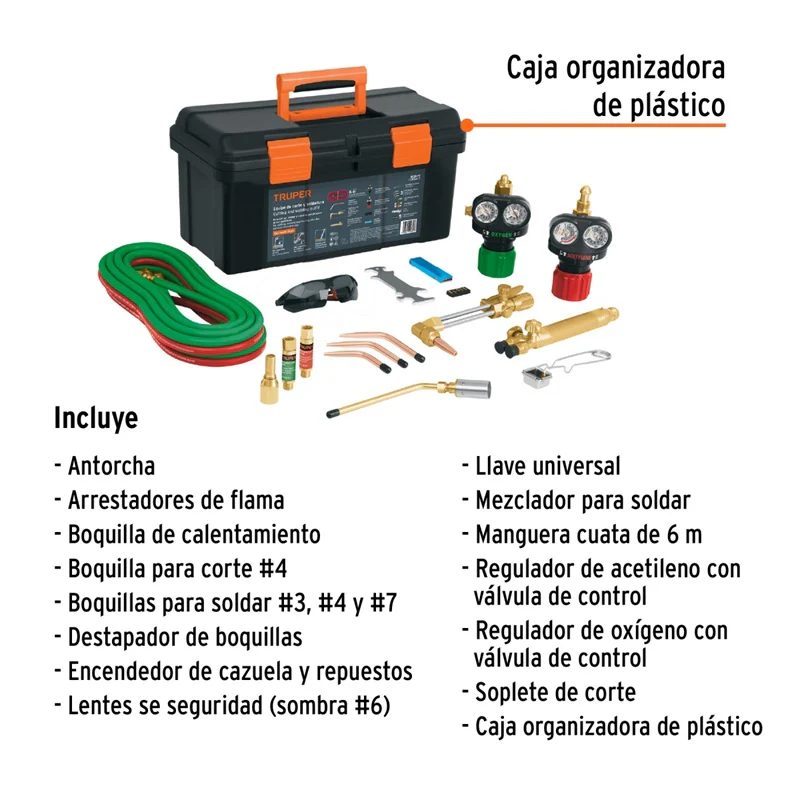 El equipo de corte y soldadura Corsol-T de Truper es una herramienta completa y versátil, ideal para trabajos profesionales y de bricolaje. Incluye todo lo necesario para realizar cortes precisos y soldaduras de alta calidad, con un diseño robusto y duradero que asegura un rendimiento óptimo en cada uso. Su facilidad de uso y sus componentes de alta calidad garantizan resultados profesionales, haciendo de este equipo una inversión esencial para talleres y proyectos de construcción y reparación. Ideal para quienes buscan eficiencia y precisión en sus trabajos de corte y soldadura.
