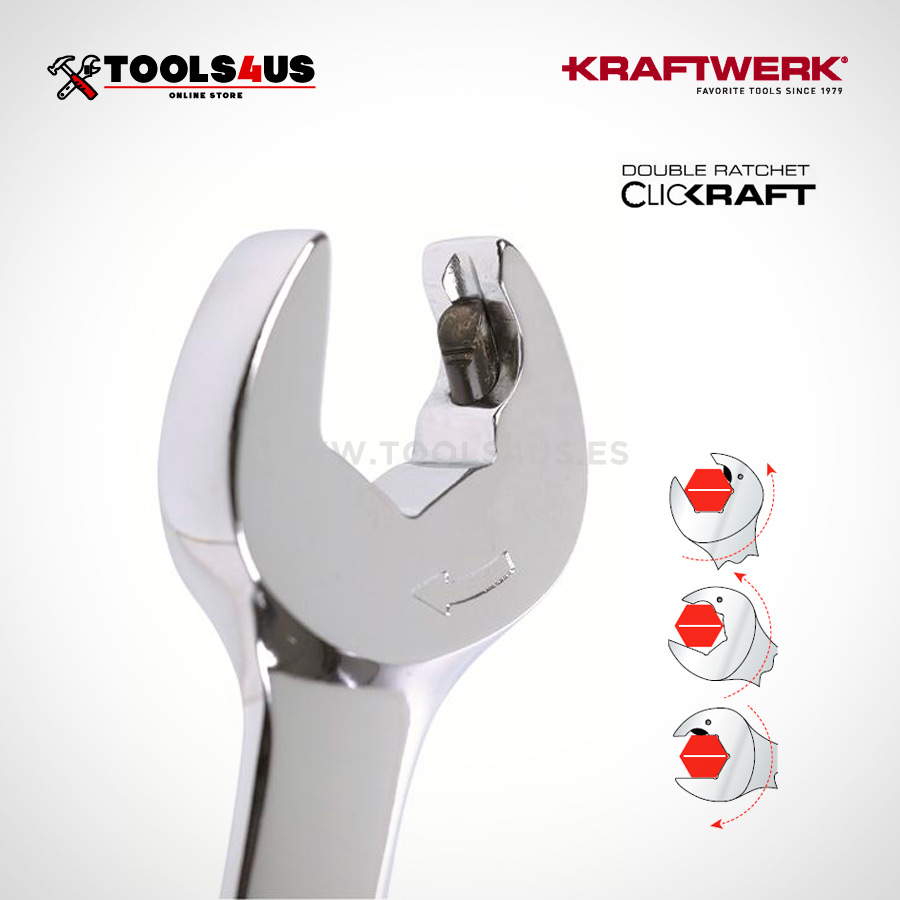 Juego de llaves planas combinadas doble con carraca, con mecanismo adicional efecto carraca en la boca abierta Clickraft