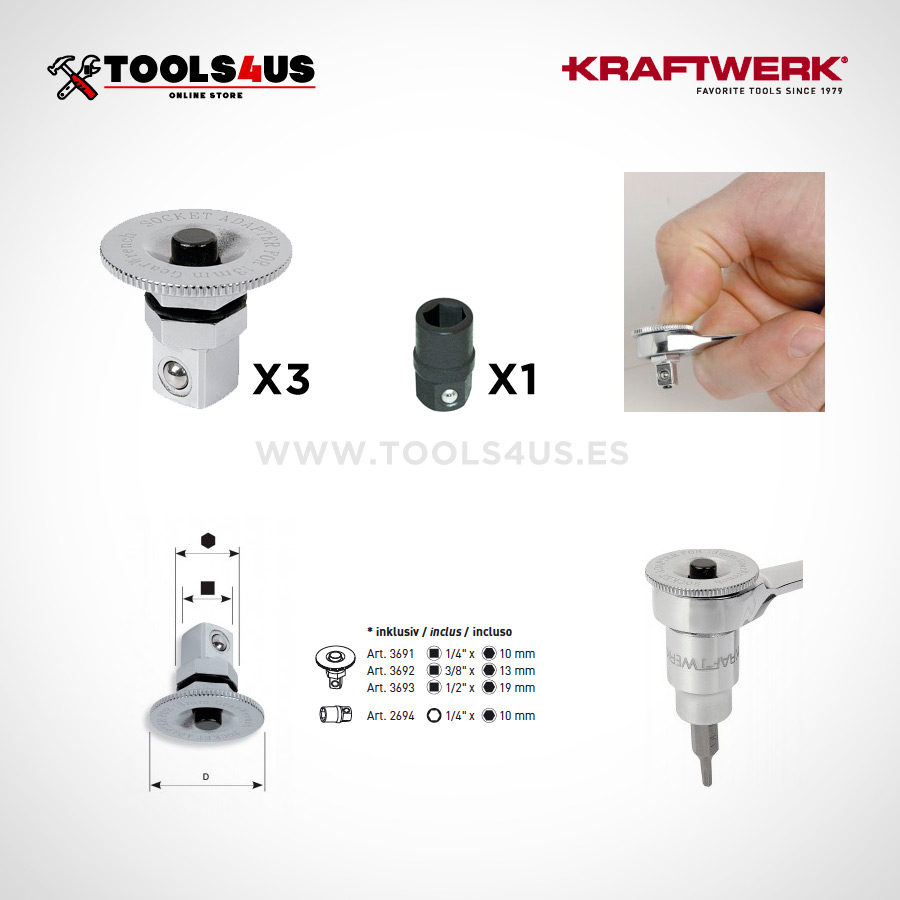 Incluye los 3 adaptadores cuadrado para vasos de 1/4″ 3/8″ y 1/2″ combinados con los exagonales de 10mm 13mm y 19mm