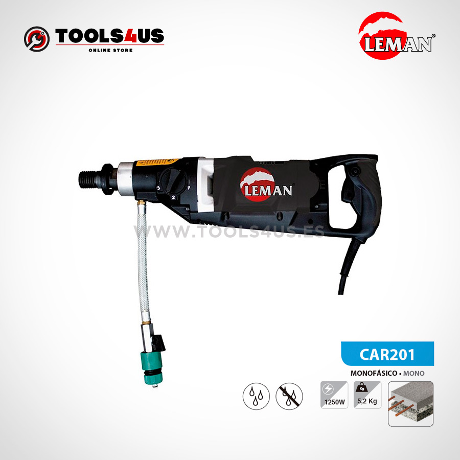 La refrigeración de la broca se realiza por agua para taladrar en hormigón, consiguiendo cortes más rápidos y un menor desgaste de las coronas. Dispone de control de arranque suave que limita la velocidad de inicio e indicador Led de sobrecarga con protección eléctrica, mecánica y térmica contra sobrecargas.