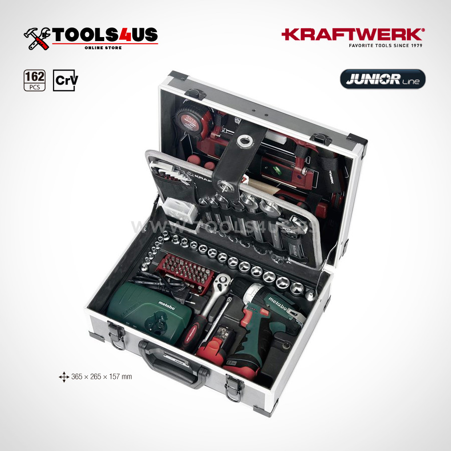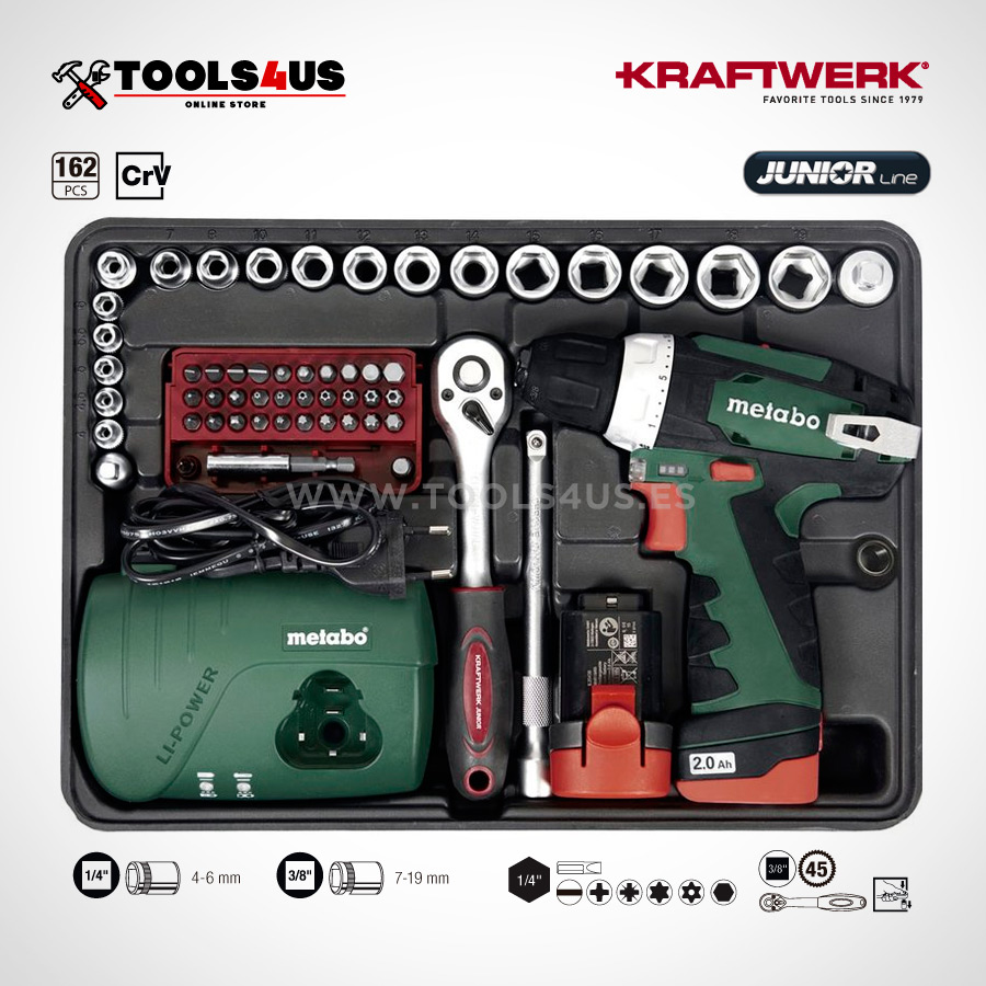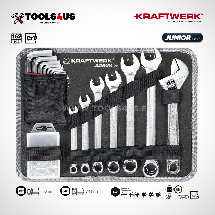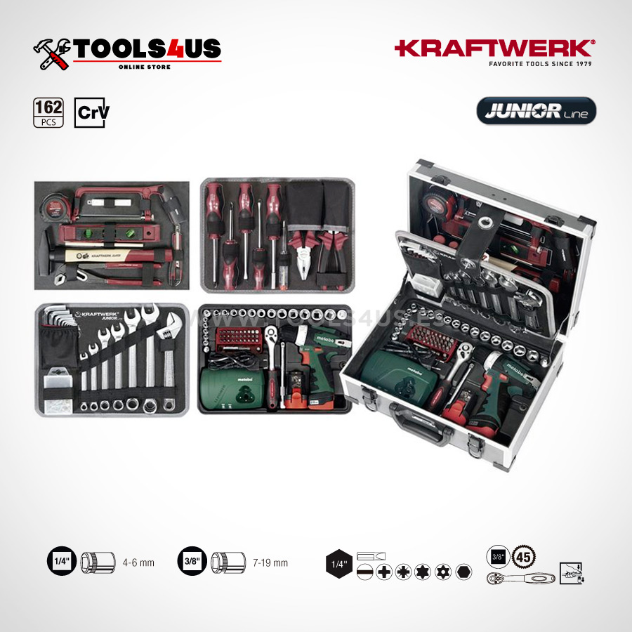 Carraca de 3/8, Set de vasos, Set de llaves, Set de alicates, Set de puntas, Sierra, Cinta métrica y muchas más piezas.