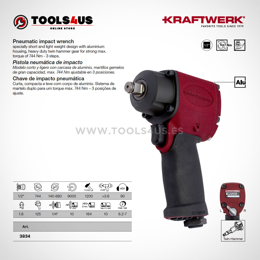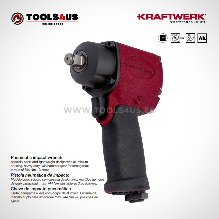 Modelo corto y ligero con carcasa de aluminio, martillos gemelos de gran capacidad, max. 744 Nm ajustable en 3 posiciones.